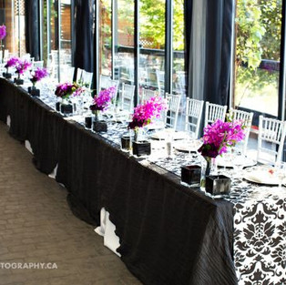The combination of colours and patterns in Desiree and Rob's reception made Summerhill's Veranda bright and airy. The double cream ceiling drape gave depth to the ceiling and created a lot of light. The damask patterned runners worked with the fuschia orchids in the centrepieces to create a super chic look while giving a fun and welcoming vibe.